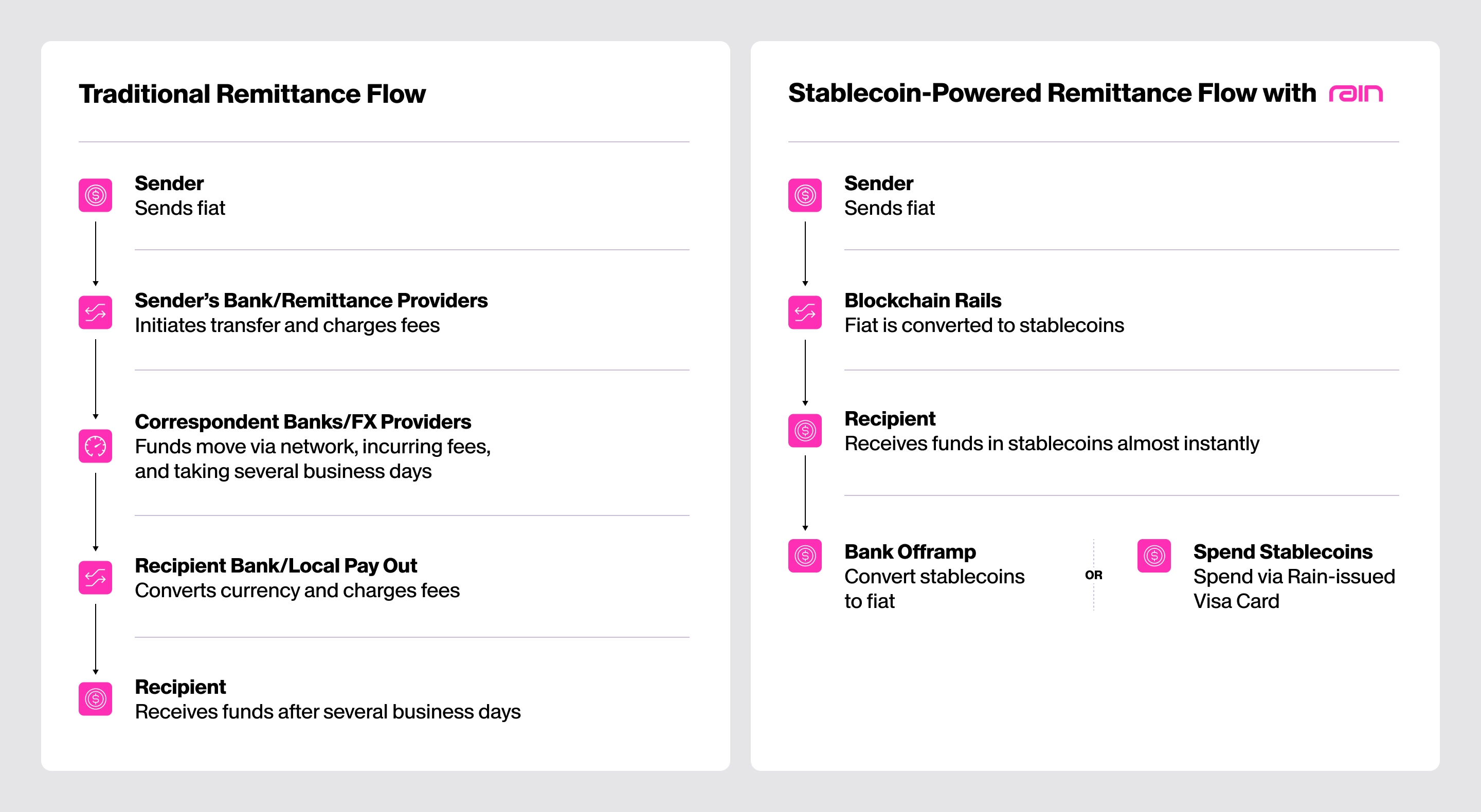 By removing friction at the point of use, Rain gives recipients instant access to funds and enables remittance providers and payout platforms to move money more efficiently from send to spend.
